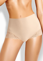 Трусы макси женские из эластичного хлопкового полотна. Обработка краев по талии жаккардовая резинка, по ноге - полуокантовка. По переду боковые вставки из сетки, швы застилом.