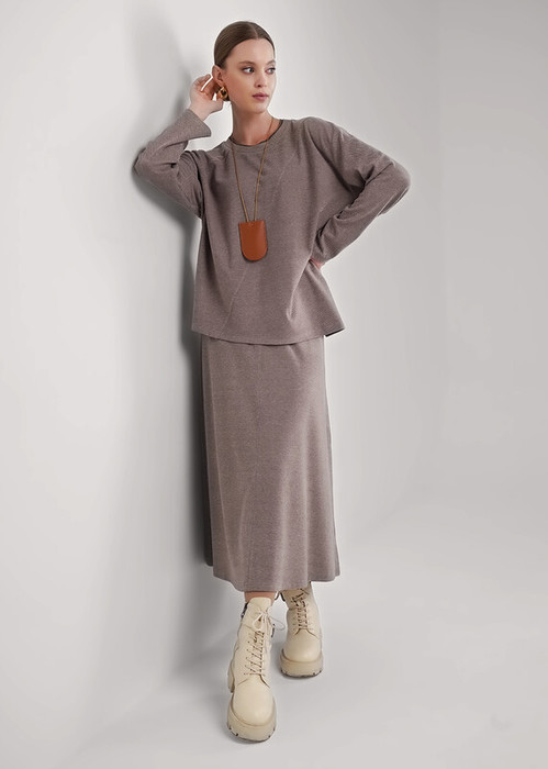 Юбка миди слегка расклешенного силуэта из поливискозного трикотажного полотна джерси. По талии пояс на резинке. По переду и спинке расстроченный средний шов.