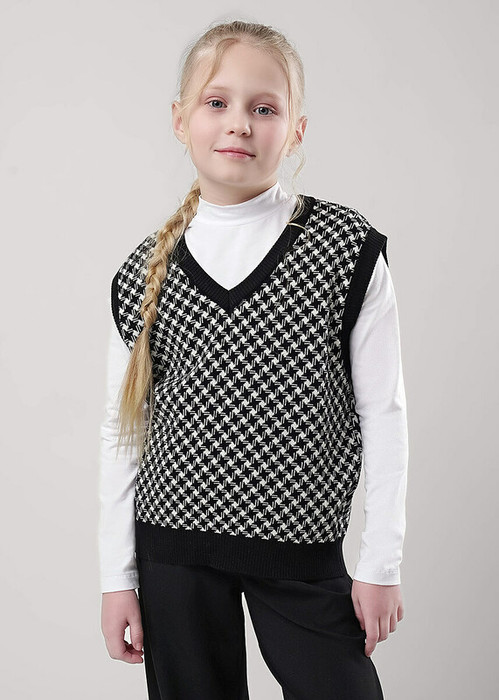Вязаный жилет для девочки с ""V""-образным вырезом горловины, из хлопковой пряжи с добавлением акрила. Модель выполнена в трендовой расцветке ""ломаная клетка""