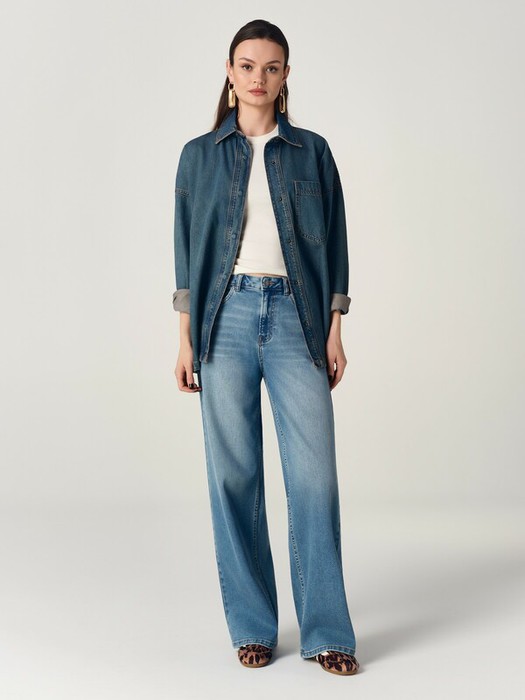 Синие джинсы wide leg с вытачками на талии по спинке помогут сформировать выразительный, но комфортный и расслабленный образ. Вытачки создают утончённый силуэт в области талии, который гармонично сочетается с лёгкостью широких штанин. Модель ultra-long  –  отличный вариант для трендовых стилизаций с брюками в пол.