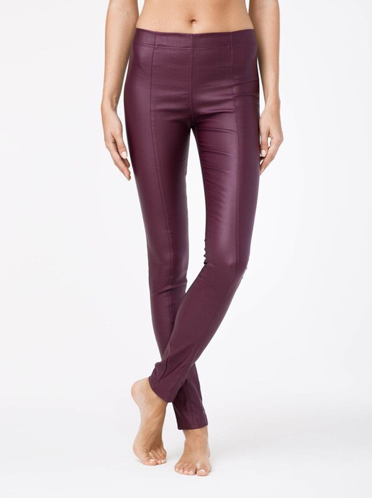 Леггинсы женские из текстильной ткани с напылением "под искусственную кожу". По левой задней половинке настрочена листочка. По передним половинкам рельефные швы, отстроченные отделочной строчкой. Верх изделия обработан широкой резинкой швом в подгибку. По среднему шву передней и задней половинок прострочена двойная отделочная строчка. В силу особенностей полотна рекомендуем выбирать леггинсы GLORY на размер больше собственного.