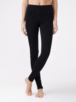 Леггинсы женские, облегающие из однотонного трикотажного полотна. По переду имитация гульфика и боковых карманов. По спинке кокетки и накладные карманы. Верх изделия обработан поясом с эластичной тесьмой внутри. По правому переднему шву нашиты аппликации в виде бабочек.