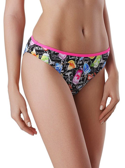 Трусы-бикини MOJITO со средней посадкой отлично смотрятся на фигуре и подчеркивают соблазнительные формы.Вам понравятся:- трендовый летний принт;- окантовку из отделочного, контрастного по цвету полотна.