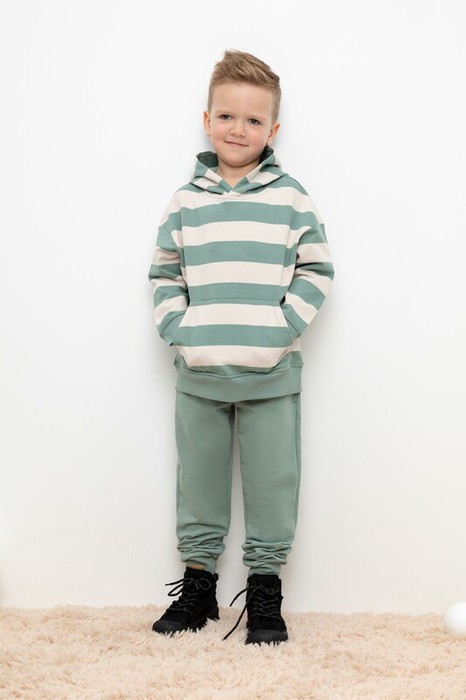 Трикотажные брюки для мальчика из петельчатого футера. Эластичный пояс на резинке регулируется по ширине с помощью шнурка, по бокам два удобных кармана, внизу эластичные манжеты.