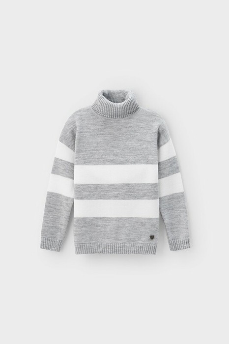 Вязаный джемпер для девочки из мягкой полушерстяной пряжи. Высокий воротник с отворотом хорошо защищает от холода. Длинные рукава с манжетами. Внизу эластичный пояс. Изделие сохраняет форму и стойкий цвет после многочисленных стирок.