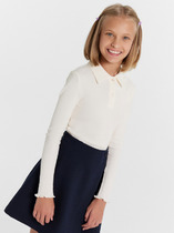 Вязаный джемпер для девочки из мягкой полушерстяной пряжи. Длинные рукава с манжетами. Внизу эластичный пояс. Для удобства изделие застёгивается на пуговицы на плече в размерах 92-104. Изделие сохраняет форму и стойкий цвет после многочисленных стирок.