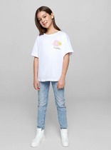 Футболка укороченная для девочки из высококачественного трикотажного полотна. Оригинальный принт выполнен из стойких текстильных гипоаллергенных красителей. Для удобства одевания на спинке в размерах 92 и 98 есть застежка на кнопки.