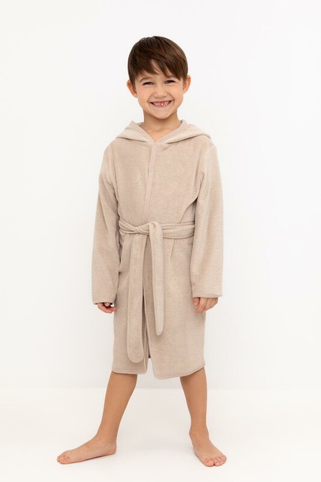 Однотонный махровый халат для мальчика на запахе без начёса. Капюшон с мягким подкладом украшен аппликацией с изображением мишки и объёмными ушками. Пояс продет в петли. На груди дополнительная застёжка на две кнопки. По бокам удобные карманы. Рукава и края изделия обработаны кантом.