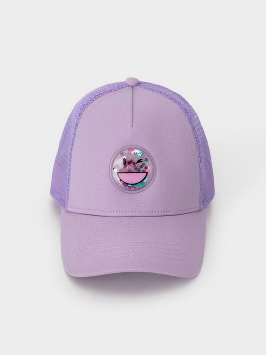 Кепка для девочки из текстиля и сетки. Спереди украшена оригинальной нашивкой с блёстками. Регулируется по ширине головы и фиксируется на затылке с помощью пластиковой застёжки.