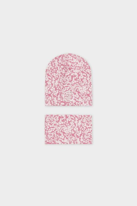 Комплект для девочки: шапка и снуд из хлопкового трикотажа в рубчик с добавлением эластана. Набивка выполнена из стойких гипоаллергенных красителей. Изделия хорошо тянутся, после многократных стирок сохраняют цвет и форму.