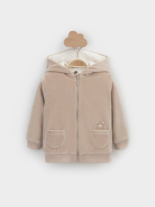 Тёплая куртка из велюра для новорождённых. Внутри синтепон и подклад из натурального хлопка. Изделие застёгивается на молнию и имеет капюшон. На рукавах мягкие манжеты, внизу - эластичный пояс. Спереди два накладных кармана и украшение в виде вышивки. Все трикотажные полотна производятся в соответствии с нормами Швейцарского сертификата ЭкоТекс.