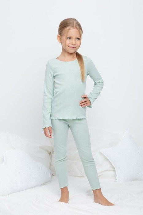 Трикотажная пижама в рубчик из натурального хлопка . Джемпер с длинными втачными рукавами. У лосин мягкий, эластичный пояс на резинке.  Комплект сохраняет цвет и форму после многократных стирок. Все трикотажные полотна производятся в соответсвии с нормами Швейцарского сертификата ЭкоТекс.