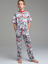 Пижама для мальчика из натурального хлопка. Джемпер с длинными втачными рукавами и брюки с эластичной резинкой в поясе. Мягкие манжеты по низу брюк сделаны из материала в рубчик. Оригинальная набивка и принт выполнены из стойких текстильных гипоаллергенных красителей. Изделие сохраняет цвет и форму после многократных стирок. Все трикотажные полотна производятся в соответствии с нормами швейцарского сертификата ЭкоТекс.