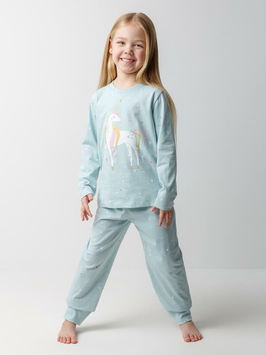 Трикотажная пижама из натурального хлопка. Джемпер с длинными втачными рукавами и брюки с эластичной резинкой в поясе. Мягкие манжеты по низу брюк. Оригинальные набивка и принт выполнены из стойких гипоаллергенных текстильных гипоаллергенных красителей. Изделие сохраняет цвет и форму после многократных стирок. Все трикотажные полотна производятся в соответсвии с нормами швейцарского сертификата ЭкоТекс.