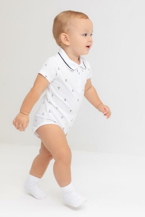 Боди для мальчика из трикотажного набивного полотна пике. Вязаный воротник. Оригинальная набивка выполнена из стойких текстильных гипоаллергенных красителей. Удобная застежка на кнопки спереди и по низу изделия.
