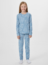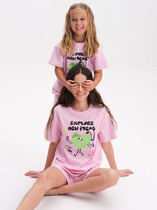 Трикотажный пижамный комплект из натурального хлопка. У футболки короткие рукава со спущенными плечами. Шорты с поясом на резинке. Оригинальная набивка выполнена из стойких, гипоаллергенных текстильных красителей. Все трикотажные полотна производятся в соответствии с нормами Швейцарского сертификата ЭкоТекс.