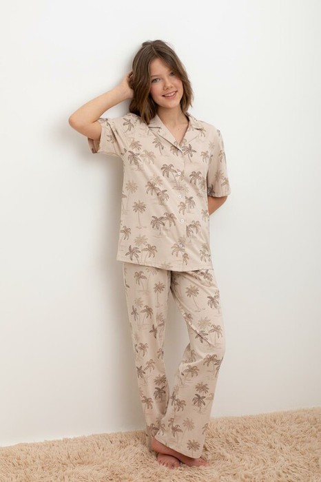 Трикотажный пижамный комплект из натурального хлопка. В комплекте рубашка с короткими рукавами и  застежкой на пуговицы. Прямые  брюки с удобным поясом на резинке. Оригинальная набивка выполнена из стойких, гипоаллергенных текстильных красителей. Все трикотажные полотна производятся в соответствии с нормами Швейцарского сертификата ЭкоТекс.