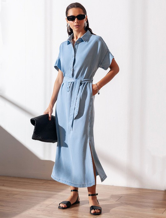 Состав: 70%Лиоцелл (Вис) 20%ПЭ 10%Вис Плотность: 7,8 OZДжинсовое длинное платье-рубашка плотностью 7,8 OZ светло-голубого цвета с поясом и разрезами — универсальное решение для современного гардероба. Модель легко вписывается как в повседневный, так и в деловой стиль. Пояс отлично подчеркивает талию, а цельнокроеный рукав добавляет комфорта. Высокие разрезы по бокам обеспечивают свободу движений, добавляют динамики образу и стиля. Особенность этого платья - состав ткани, сочетающая прочность и мягкость лиоцелла с вискозой, что делает её невероятно комфортной, дышащей,, устойчивой к сминанию и идеально подходящей для чувствительной кожи. Благодаря нежным тактильтным ощущениям, будто шелк, от которого ощущается приятная прохлада, легкое платье подойдет на теплое время года и даже на жаркое лето. Повседневное платье с коротким рукавом подходит на большие размеры и способно подчеркнуть красоту любой фигуры. Продуманный свободный крой платья с отложным воротничком отлично садится на разные типы телосложения, создавая аккуратный и современный образ. Классический силуэт сочетается с различными аксессуарами, что делает платье на пуговицах универсальным выбором для повседневной носки и особых случаев.