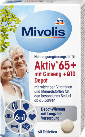 Благодаря сбалансированному составу Mivolis Active* 65+ с женьшенем + Q10 Depot разумно дополняет рацион людей в возрасте 65 лет и старше и поддерживает жизненный тонус¹⁺² и работоспособность¹⁺². ¹Иммунитет и энергия: витамины D, C и цинк способствуют нормальному функционированию иммунной системы. *В то же время витамин B12 способствует снижению усталости и усталости и поддерживает нормальный энергетический обмен. ²Сердце: Тиамин способствует нормальной работе сердца, а фолиевая кислота — нормальному кроветворению. «Концентрация и нервы: витамин B2 поддерживает нормальное функционирование нервной системы, а железо поддерживает нормальную когнитивную функцию. ⁴Мышцы, кости и хрящи: витамин D и кальций способствуют поддержанию нормальных костей и зубов, а магний способствует нормальной функции мышц. Кроме того, содержащийся в нем витамин С способствует нормальному образованию коллагена для нормальной функции хряща. ⁵Глаза: цинк и витамин А поддерживают нормальное зрение. ⁶Кожа, волосы и ногти: биотин помогает поддерживать нормальную кожу и волосы, а селен поддерживает здоровье ногтей. Витамин Е помогает защитить клетки от окислительного стресса. Комбинацию питательных веществ дополняют корейский женьшень и коэнзим Q10. Технология депо таблеток позволяет питательным веществам высвобождаться в течение многих часов, обеспечивая тем самым долгосрочное снабжение.