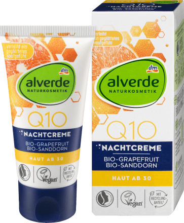 Формула ухода ночного крема Alverde Q10, изготовленная из натурального коэнзима Q10, органического экстракта грейпфрута, органического масла облепихи и органического экстракта ацеролы, обеспечивает кожу натуральным витамином С. Благодаря ценному маслу ореха макадамии и маслу какао он также восстанавливает кожу в течение ночи. и оставляет ощущение нежной кожи. Рецепт без микропластика и водорастворимых, чисто синтетических полимеров