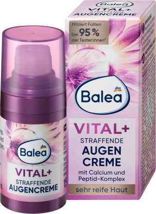 Интенсивный уход для самых высоких требований: Balea VITAL+ для новой стойкости и упругости. КАЛЬЦИЙ может помочь улучшить естественную функцию клеток и, таким образом, поддержать устойчивость кожи». ПЕПТИДНЫЙ КОМПЛЕКС и активный ингредиент VITACELL обеспечивают коже вокруг глаз длительное увлажнение² и помогают укрепить структуру кожи». Масло амаранта сохраняет кожу эластичной и мягкой. *Исследование in vivo с участием 20 тестеров после 4 недель использования. «Тест на наркотики in vitro. ²Тест на активные ингредиенты in vivo. Состав не содержит микропластика и водорастворимых, чисто синтетических полимеров.