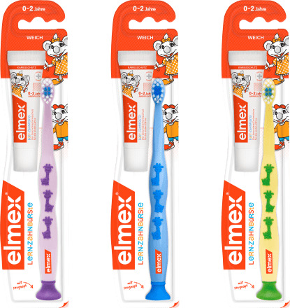 Обучающая зубная щетка elmex была разработана специально для бережной чистки первых зубов. Набор для ухода за зубами состоит из обучающей зубной щетки и зубной пасты (12 мл). Маленькая головка щетки с мягким покрытием специально адаптирована к потребностям маленьких детей. Мягкие закругленные щетинки защищают десны, бережно и тщательно очищают. Цветная щетина позволяет легко дозировать детскую зубную пасту размером с горошину. Этот товар доступен в различных цветах/мотивах. К сожалению, предварительно выбрать конкретный цвет или мотив для этого заказа невозможно.