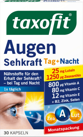 Наши глаза часто подвергаются большой нагрузке – от работы за компьютером, постоянного просмотра мобильного телефона, длительных поездок на автомобиле, просмотра телевизора, сухого воздуха в помещении и многого другого. Кроме того, с возрастом зрение может ухудшаться. Taxofit Eyes Vision с витамином А, В2 и цинком помогает поддерживать зрение, а антиоксиданты, витамины С, Е и селен помогают защитить клетки от окислительного стресса. Добавленные лютеин и зеаксантин также относятся к каротиноидам и не могут вырабатываться самим организмом.