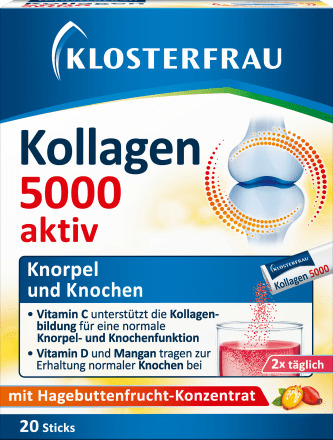 Klosterfrau Collagen 5000 с плодами шиповника помогает поддерживать нормальную функцию хрящей и костей. Питьевые гранулы, принимаемые ежедневно, способствуют сохранению подвижности в повседневной жизни. Коллаген является одним из важнейших компонентов хрящей, костей и сухожилий. Витамин С способствует нормальному образованию коллагена для нормального функционирования хрящей и костей.