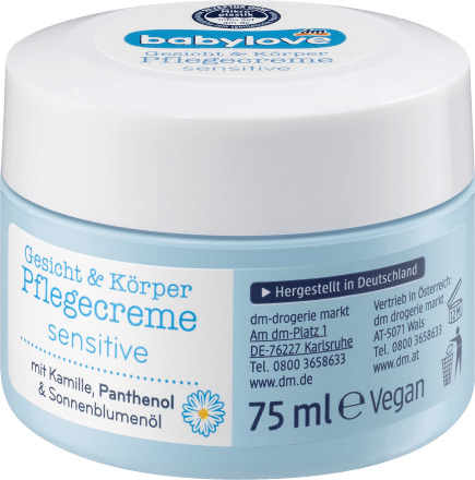 Крем для ухода за лицом и телом babylove для чувствительной кожи балует кожу ромашкой, пантенолом и подсолнечным маслом. Рецепт без микропластика и водорастворимых, чисто синтетических полимеров.