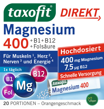 Гранулы Taxofit Магний 400 содержат витамин B12. Магний способствует поддержанию нормальной мышечной деятельности. Этот продукт веганский. 20 пакетиков по 2,0 г каждый. Гранулы Taxofit Magnesium 400 являются веганскими.