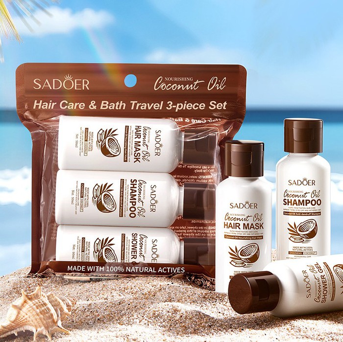 Дорожный набор косметики 3 в 1 с кокосом (Шампунь, Маска для волос, Гель для душ