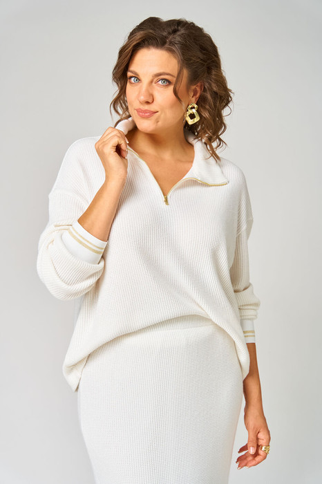 Трикотажный женский джемпер с воротником-стойкой на молнии — это идеальный выбор для создания стильного и уютного образа в прохладное время года. Изготовленный из мягкого трикотажа, в состав которого входит смесовая вискоза, этот джемпер приятно облегает тело и обеспечивает максимальный комфорт. Свободный прямой крой со спущенной линией плеча создает расслабленный силуэт, который идеально подходит для удобной носки и позволяет свободно двигаться. Длинные рукава на манжетах с полосками добавляют изделию изысканности и стиля, а также защищают от холода. Воротник-стойка на молнии не только добавляет оригинальности, но и позволяет регулировать тепло, что делает этот джемпер универсальным элементом гардероба. Он отлично сочетается как с брюками, так и с юбками, позволяя создавать разнообразные образы для разных случаев — от прогулок, праздников до встреч с друзьями или даже для работы в офисе.