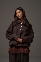 Джемпер свободного кроя. Выполнен из плотного трикотажного полотна шоколадного цвета. Воротник отложной. Застёжка центральная - акцентные пуговицы. Рукав спущенный, с манжетой. Низ изделия на резинке, регулируется. Длина рукава от линии втачивания 59 см. Длина спинки 70 см
