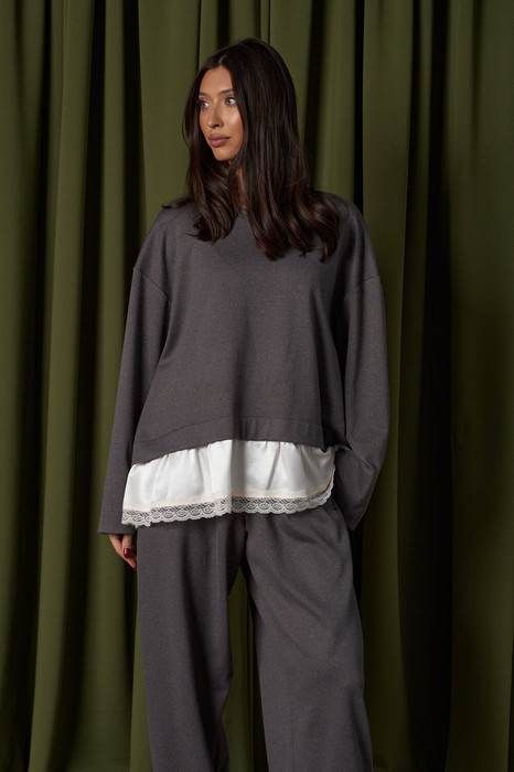 Джемпер в крое трапеция, выполнен из трикотажного полотна серого цвета. Характеристика: крой трапеция - расширяется к низу, овальная горловина, рукав спущен, спинка изделия чуть удлинена, по низу изделия пришита рюша из струящейся ткани с кружевом. Длина изделия по центру спинки 67 см ( с учетом кружева), длина рукава от края горловины 73 см.