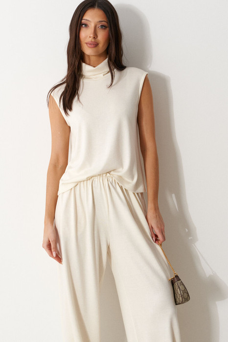 Джемпер без рукавов прилегающего силуэта, выполнен из трикотажного полотна молочного цвета. Характеристики: горловина-стойка, в естественную складку, прямой крой, без рукавов. Длина по центру спинки от края горловины 54 см.