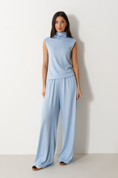 Джемпер свободного кроя. Выполнен из мягкого трикотажа голубого цвета. Горловина-стойка, в естественную складку. Длина спинки 55 см