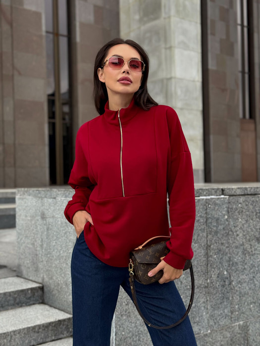 Джемпер трикотажный, свободного силуэта. Лиф обработан молнией, воротник притачной, свобдный,  рукав втачной,  свободный, по низу обработан манжетой, линия плеча спущена.