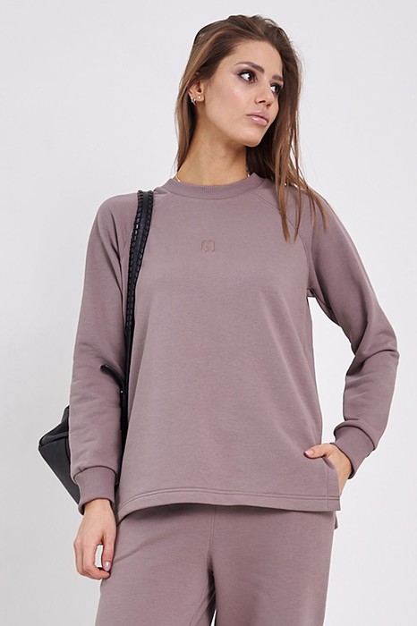 Нежный женский удлиненный свитшот, пошит из комфортной, всесезонной ткани. Свитшот имеет слегка расширенный к низу силуэт и разрезы в боковых швах. Бейка горловины, манжеты рукавов изготовлены из ткани-компаньена кошкорсе. Свитшот имеет рукава покроя реглан. По центру переда вышит логотип в цвет ткани.