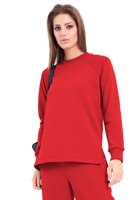 Нежный женский удлиненный свитшот, пошит из комфортной, всесезонной ткани. Свитшот имеет слегка расширенный к низу силуэт и разрезы в боковых швах. Бейка горловины, манжеты рукавов изготовлены из ткани-компаньена кошкорсе. Свитшот имеет рукава покроя реглан. По центру переда вышит логотип в цвет ткани.