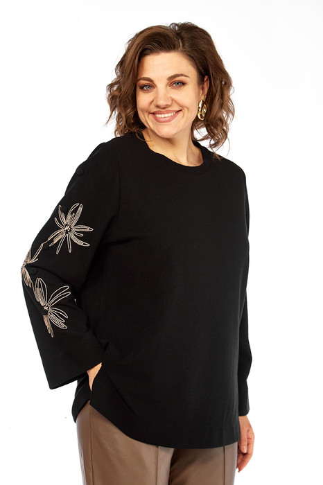 Джемпер женский, выполнен из трикотажного полотна. Перед и спинка цельнокроеные. Горловина круглой формы. Рукава втачные, декорированны вышивками и помпонами.
