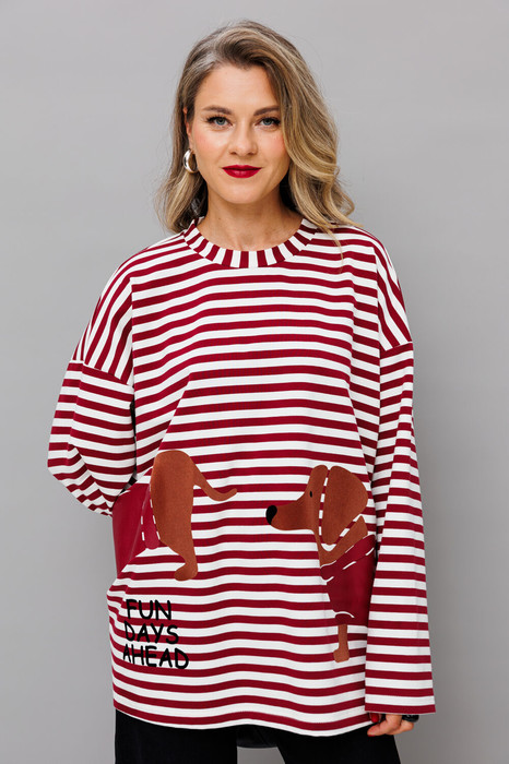 Лонг оверсайз прямого кроя. По переду выполнен дизайнерский принт в виде"собачки". Ткань полосатая двухнитка. Длина - 70 см