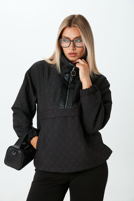 Джемпер свободного объёма из стёганой ткани. Горловина на молнии с окантовкой из экокожи. Манжеты и низ джемпера на резинке. По бокам расположены карманы.