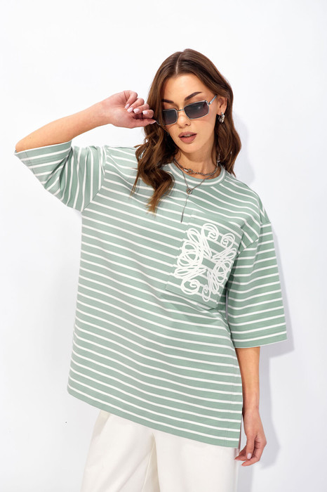 Джемпер прямого  свободного силуэта со спущенной линией плеч  из хлопкового трикотажного полотна в полоску. Вырез горловины округлый с притачной бейкой. По бокам высокие разрезы до талии. На кармане фактурная  дизайнерская печать.