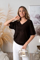 Блузка из вискозасодержащего трикотажа, свободного силуэта, оверсайз, силуэт ""летучая мышь"". Особенностью данной модели является настоящий польский фабричный мягкий высококачественный трикотаж. Блузка украшена геометрическим узором, ""ришелье"", тонкая, горловина с V-вырезом, по бедрам резинка-манжета, рукава короткие со спущенной линией плеча, с манжетами. Стильный цвет добавит современности вашему базовому гардеробу.