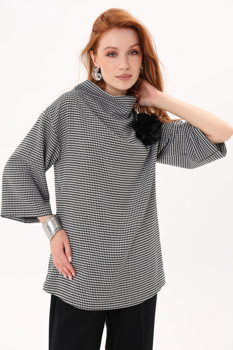 Джемпер прямого свободного силуэта. Горловина с цельнокроеным воротником-стойкой. Рукав втачной широкий, три четверти. В комплект входит съёмная авторская брошь-цветок ручной работы.
