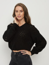 Джемпер-кейп прямого свободного силуэта. Горловина с цельнокроеным воротником-стойкой. Рукав втачной широкий, от линии локтя до запястья есть дополнительное отверстие для рук. Декорирован цветком из контрастной ткани.