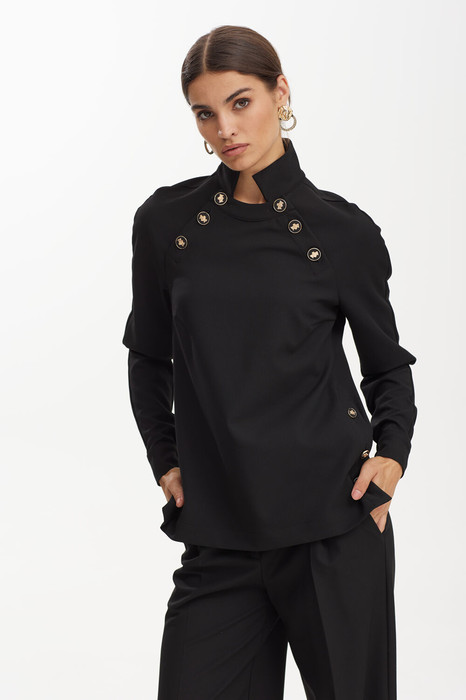 Джемпер прямого покроя из костюмной ткани. Модель сочетает в себе женственность и удобство.. Горловина переда декорирована планками с дизайнерскими пуговицами. В боковых швах сделаны планки с дизайнерскими пуговицами.