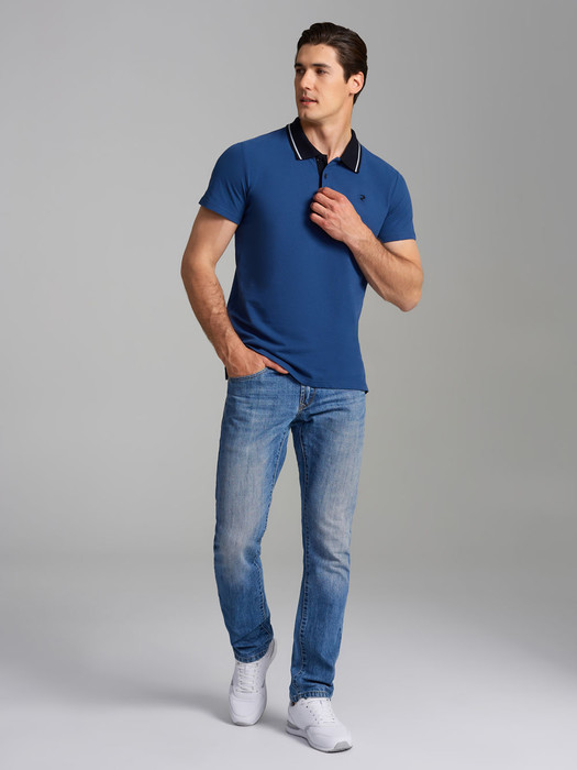 Футболка-поло из хлопкового полотна "пике". Классическая модель поло с короткими рукавами. Воротник и манжеты рукава выполнены из трикотажной рибаны темно-синего цвета с белой полосой. На полочке застежка-планка на пуговицах. На полочке вышивка "R". По низу футболки в боковых швах выполнены разрезы, обработанные тесьмой.