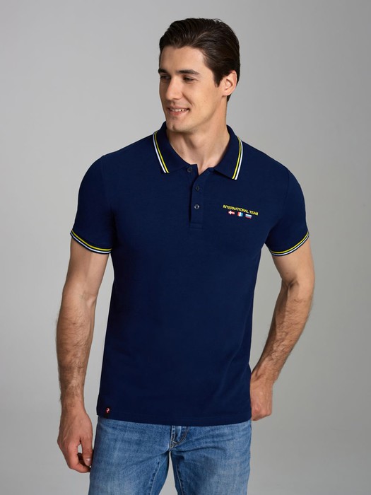 Футболка-поло из хлопкового полотна "пике". Классическая модель поло с короткими рукавами. Воротник и манжеты рукава выполнены из трикотажной рибаны темно-синего цвета с бело-желтой полосой. На полочке застежка-планка на пуговицах. На нижней планке и по горловине настрочена контрастная киперная тесьма. На полочке выполнена вышивка "INTERNATIONAL TEAM" и вышивка флагов. По низу футболки в боковых швах выполнены разрезы, обработанные тесьмой. С правой стороны полочки, по низу настрочен жаккардовый "флажок" с логотипом.
