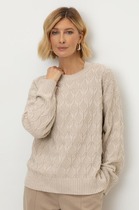 Джемпер женский из трикотажной хлопковой ткани (двунитка). По переду джемпера расположены декоративные элементы. Спущенное плечо, рукав 3/4. Низ рукава обработан манжетой. Вырез горловины круглый, оформлен бейкой.